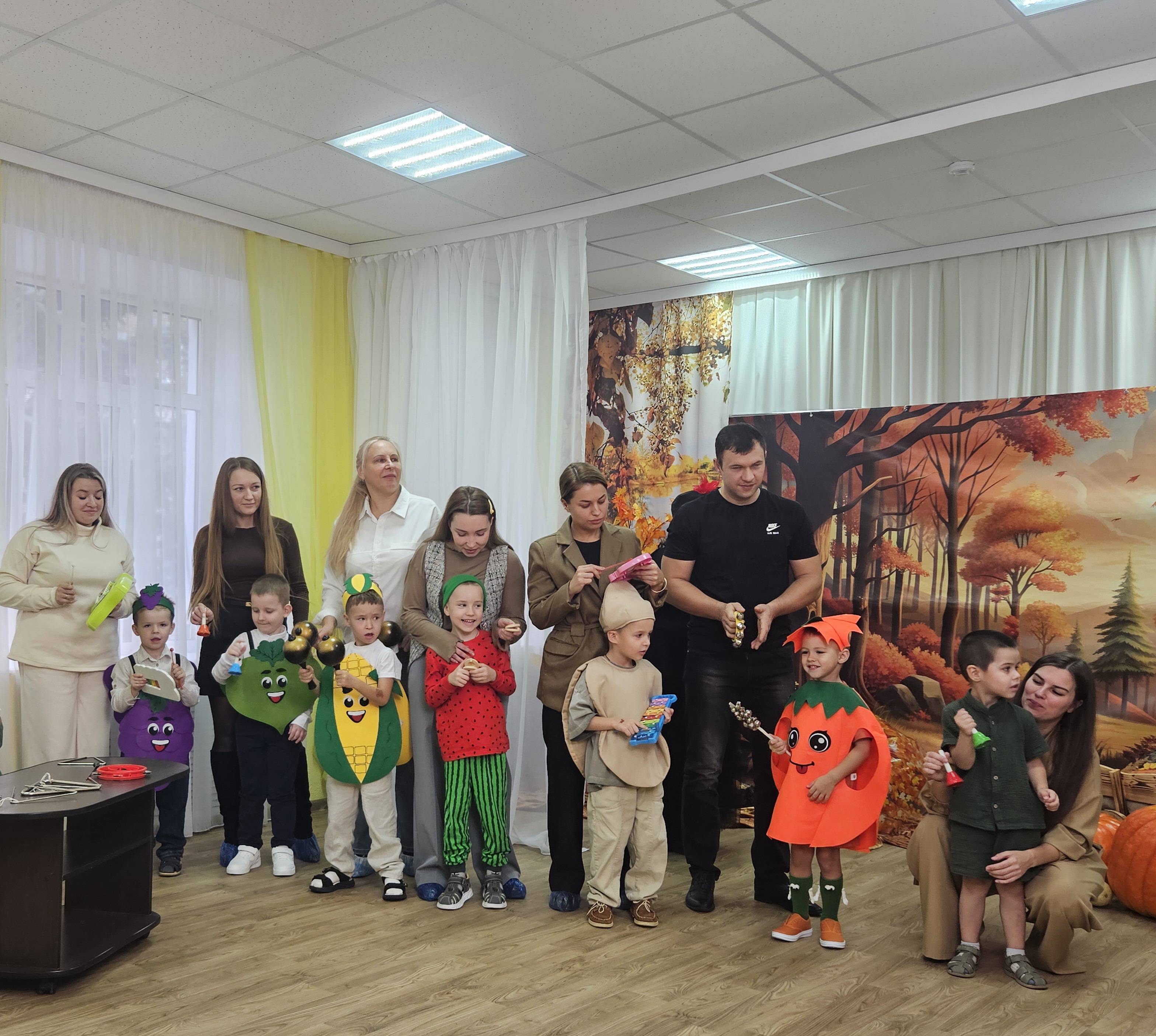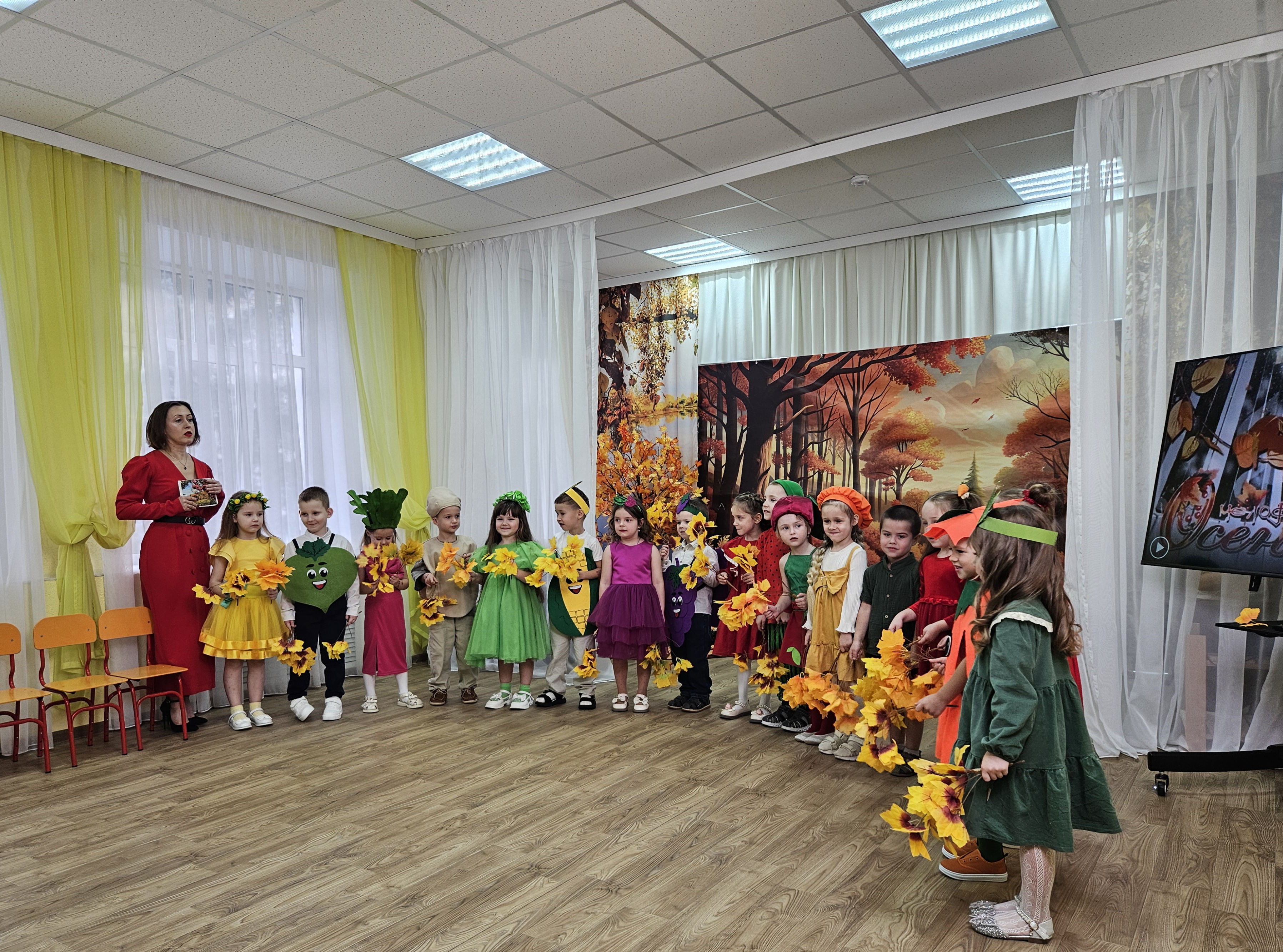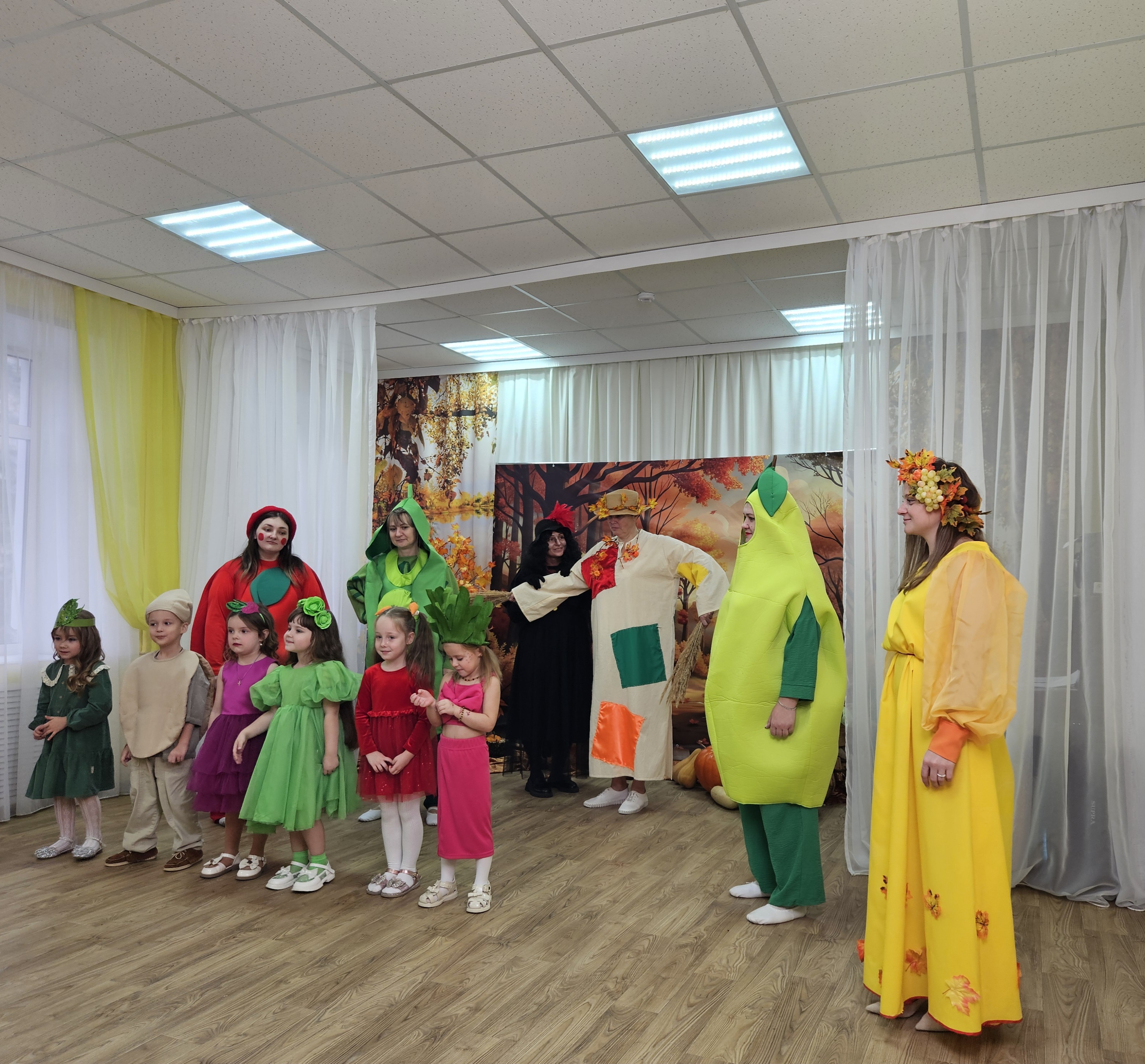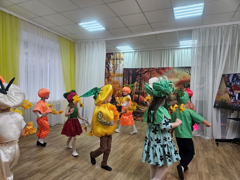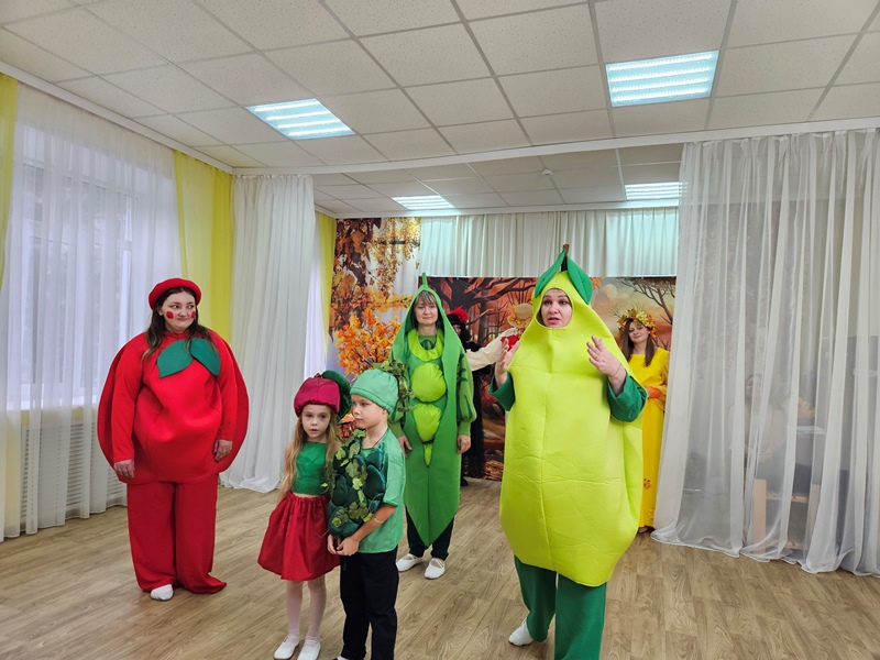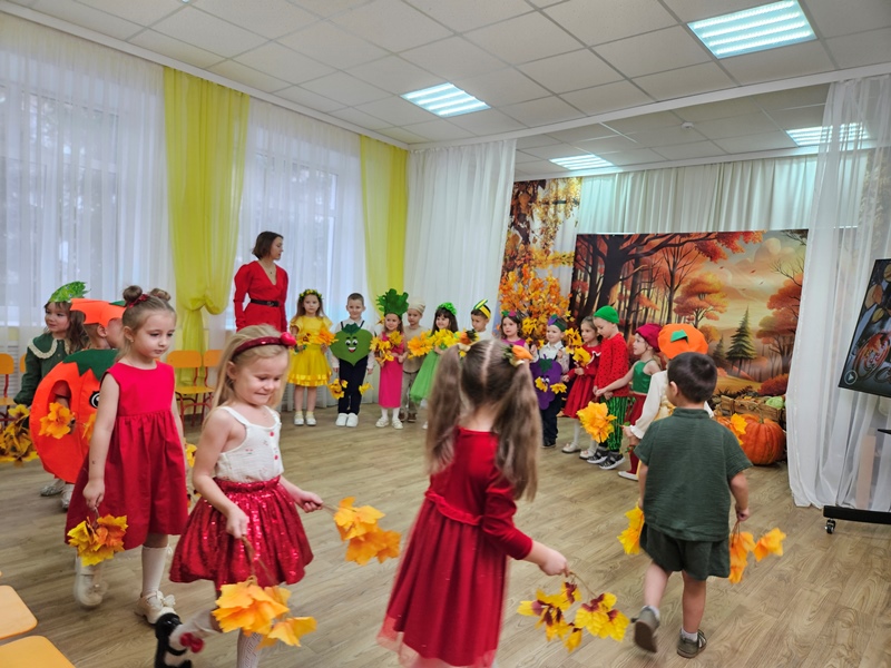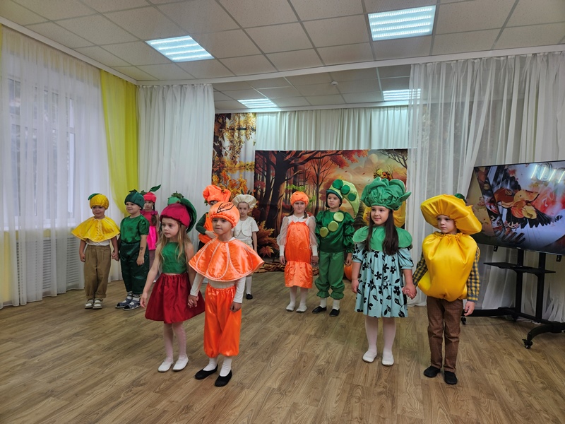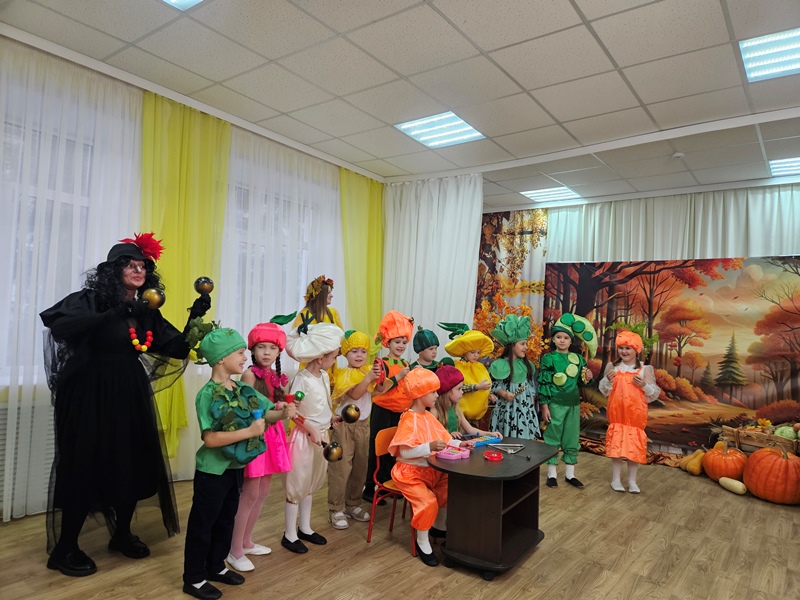 Наш музыкальный зал на один день превратился в шумную и красочную овощную грядку. Яркие гирлянды из листьев, настоящие тыквы и корзинки с дарами осени создали по-настоящему праздничную атмосферу.