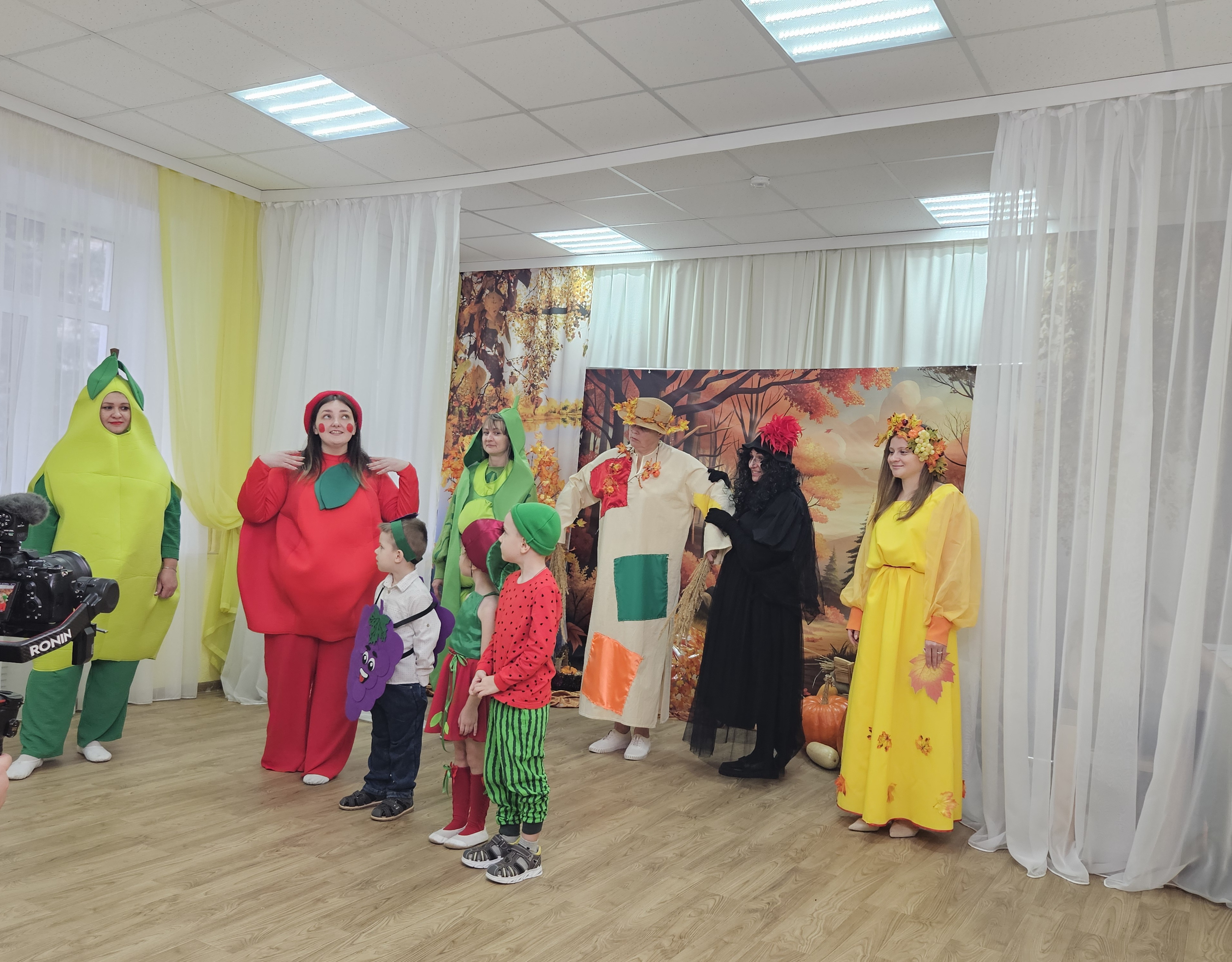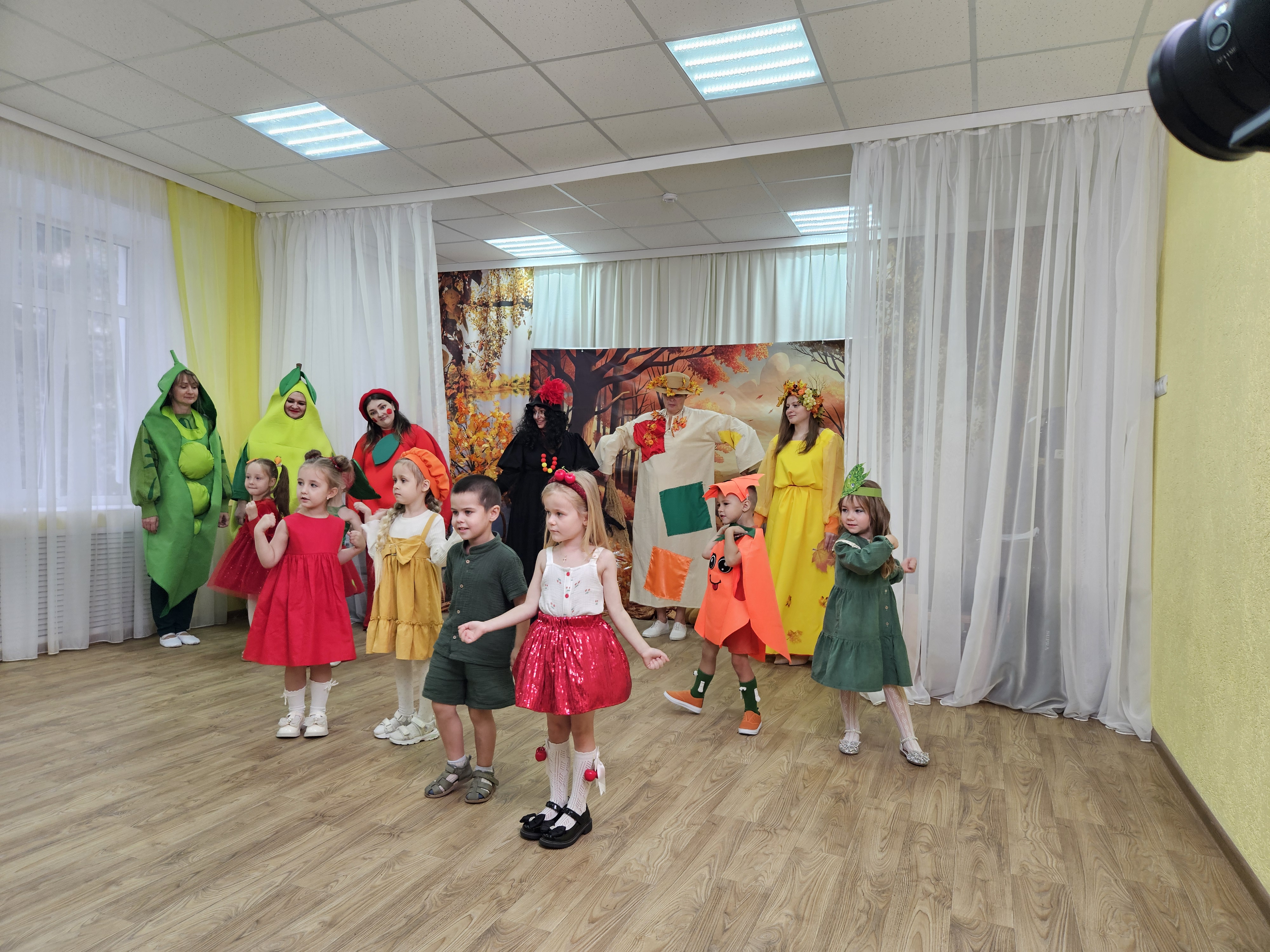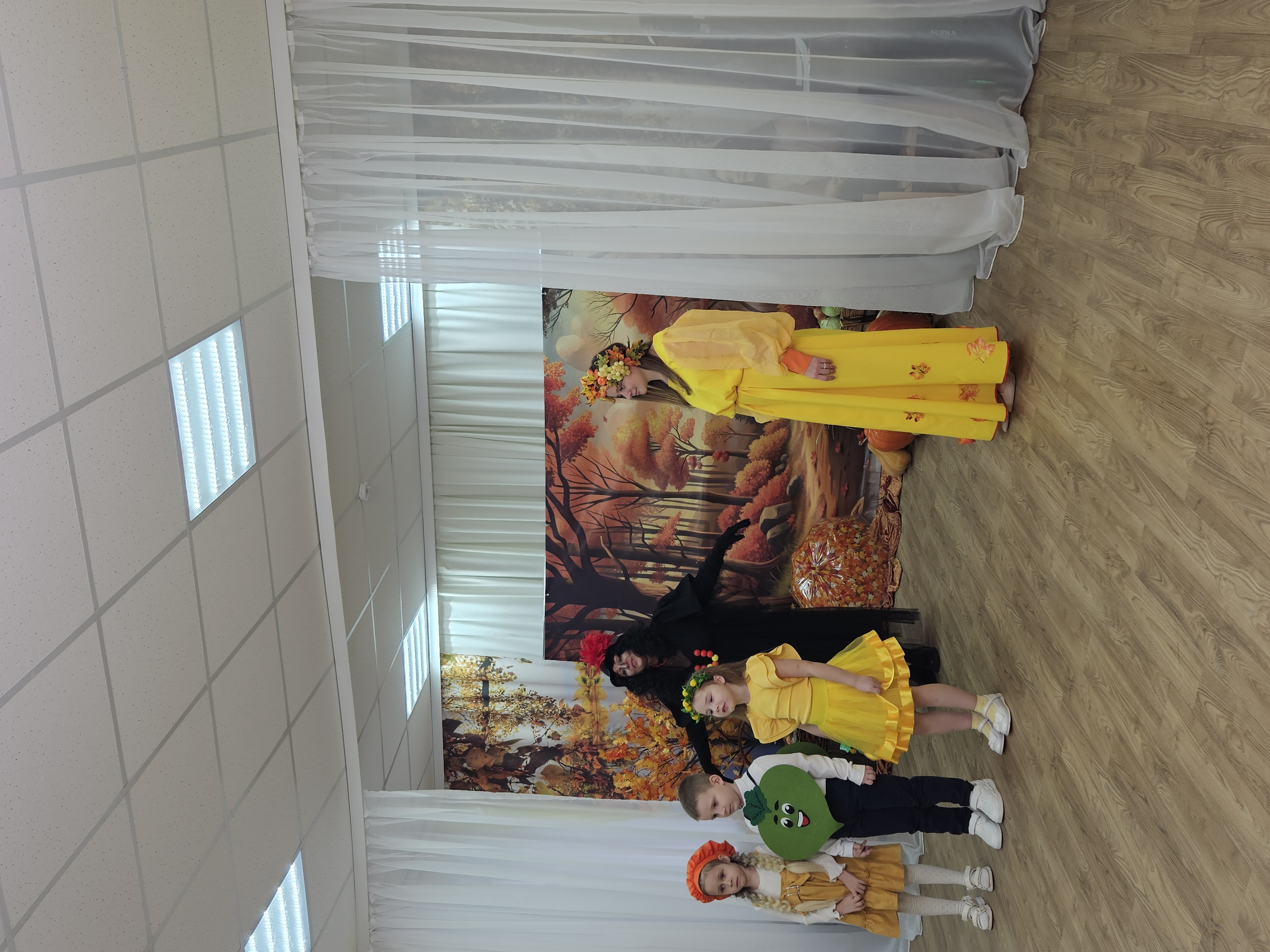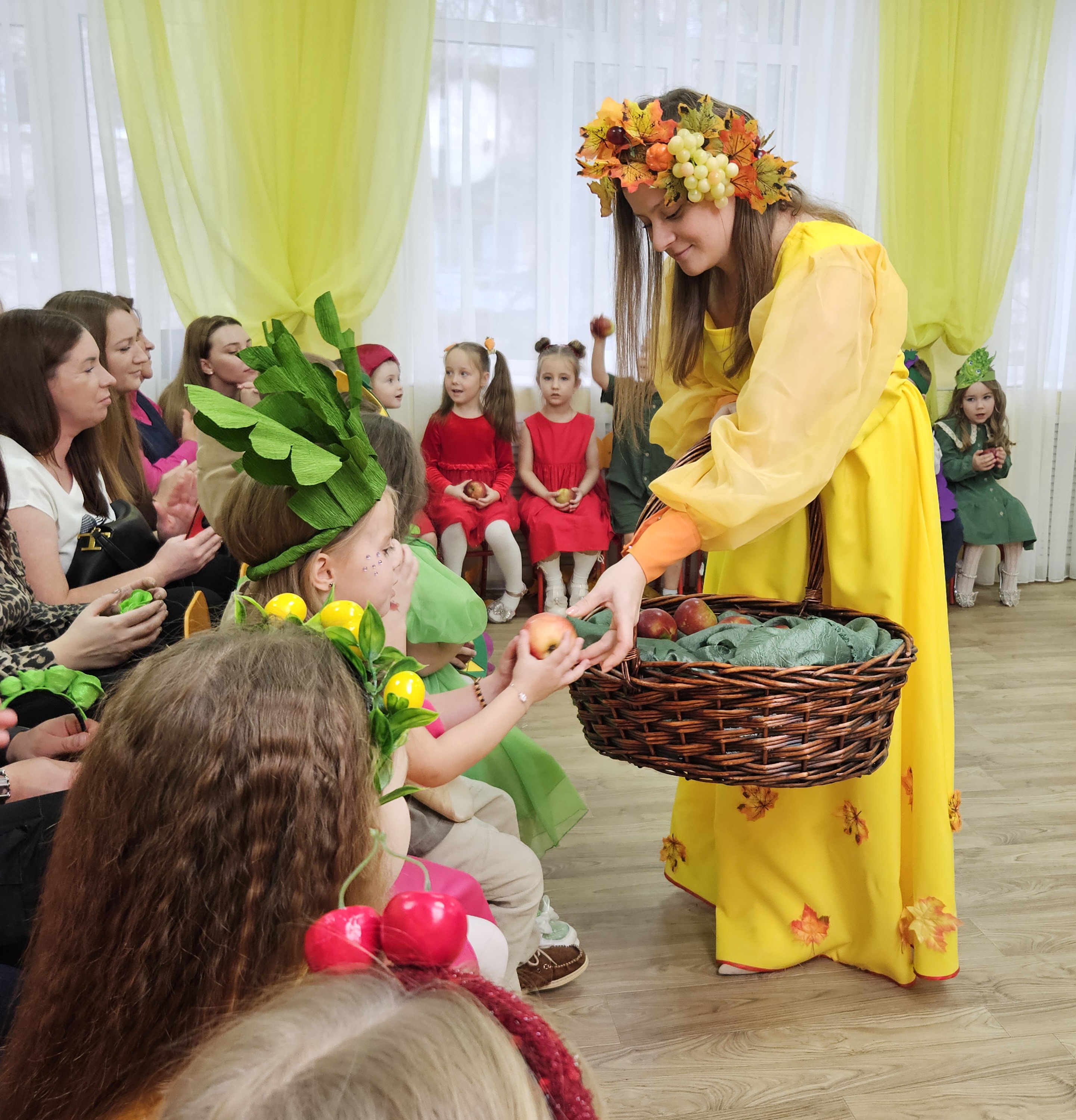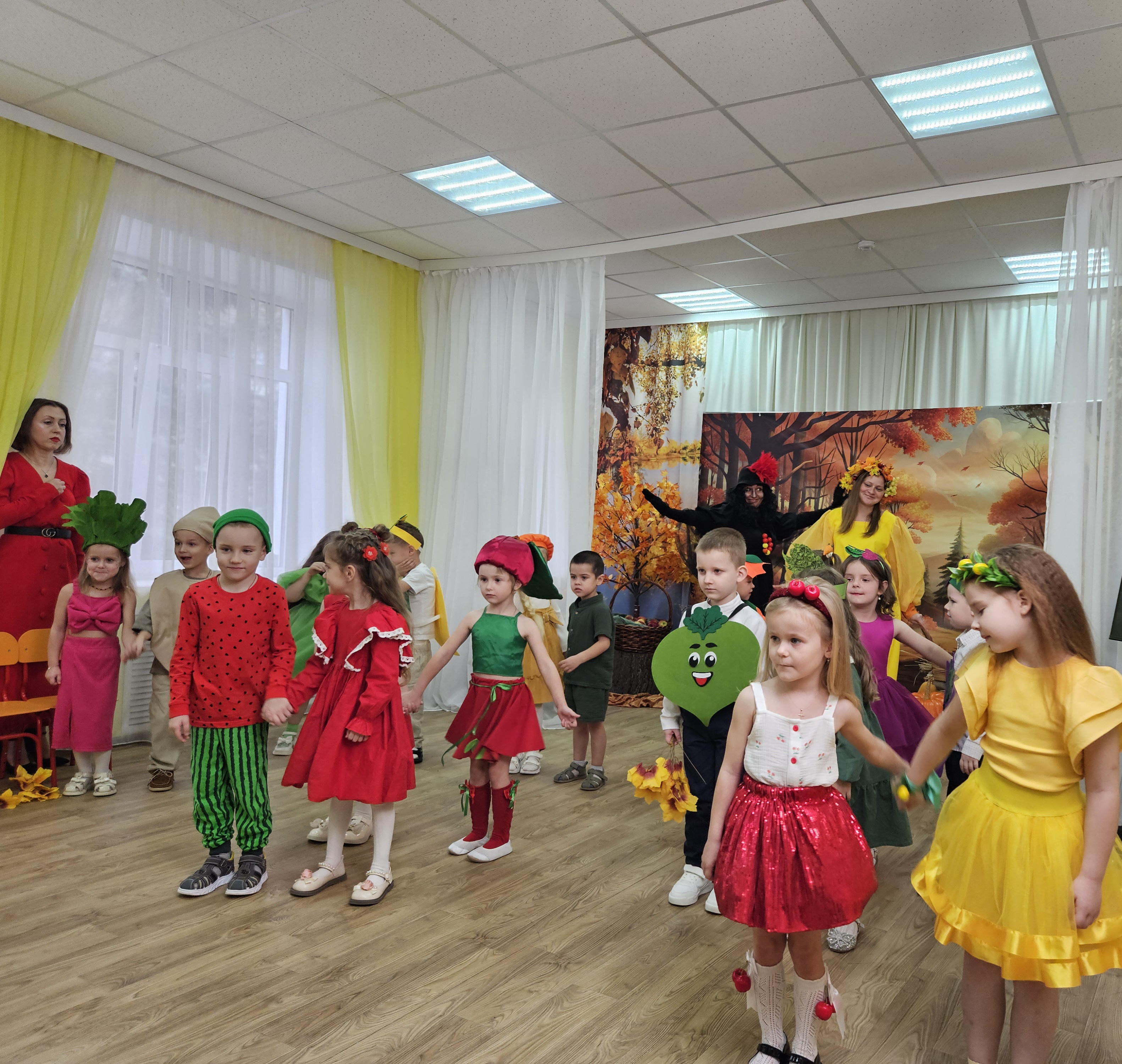 Наш музыкальный зал на один день превратился в шумную и красочную овощную грядку. Яркие гирлянды из листьев, настоящие тыквы и корзинки с дарами осени создали по-настоящему праздничную атмосферу.