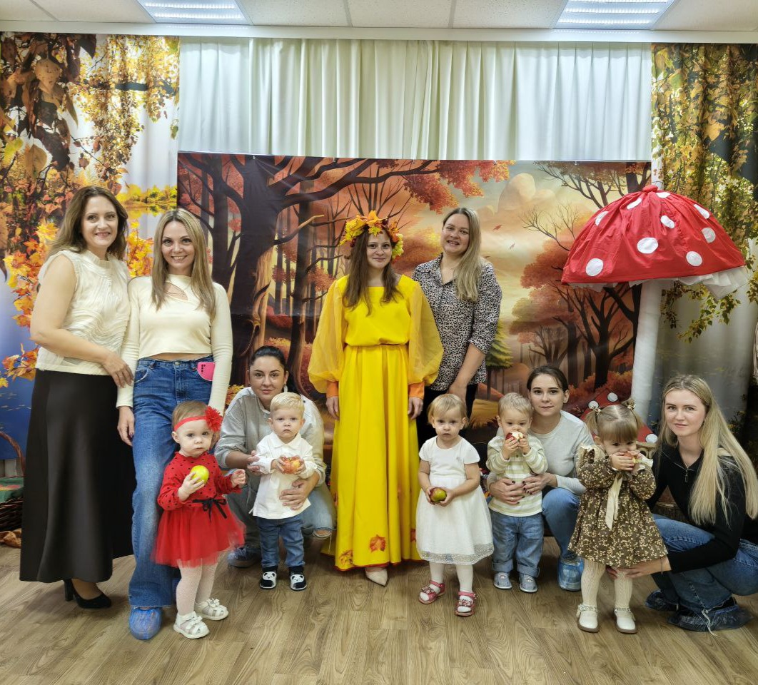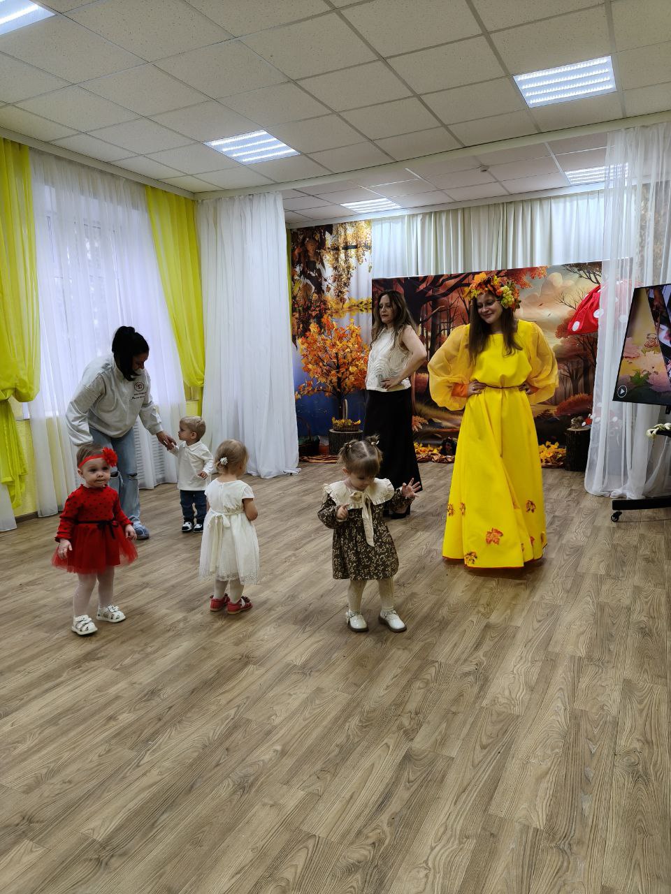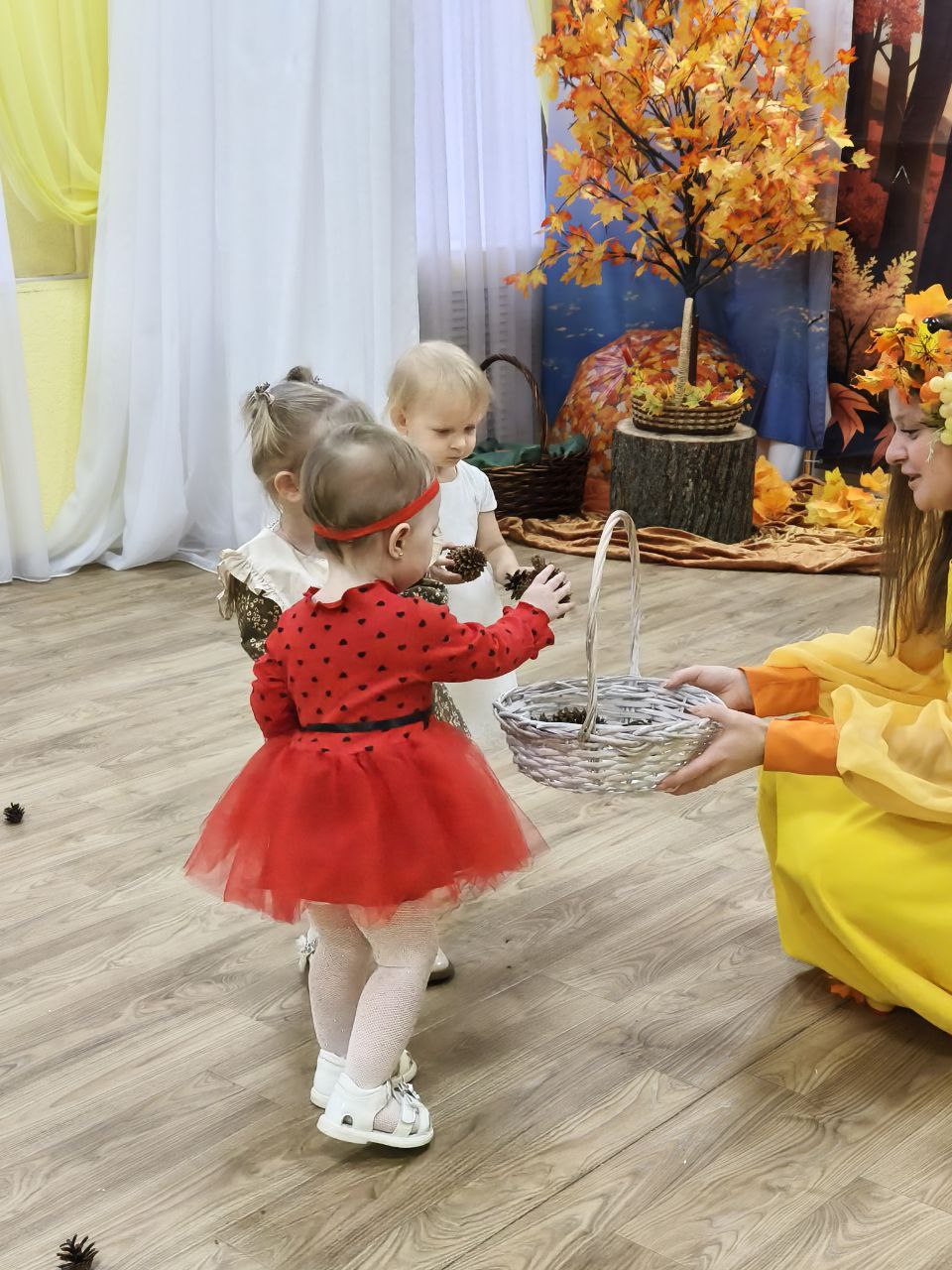 Малыши раннего возраста помогали красавице Осени собирать урожай в лукошки, играть и устраивать настоящий "листопад" из разноцветных листьев.