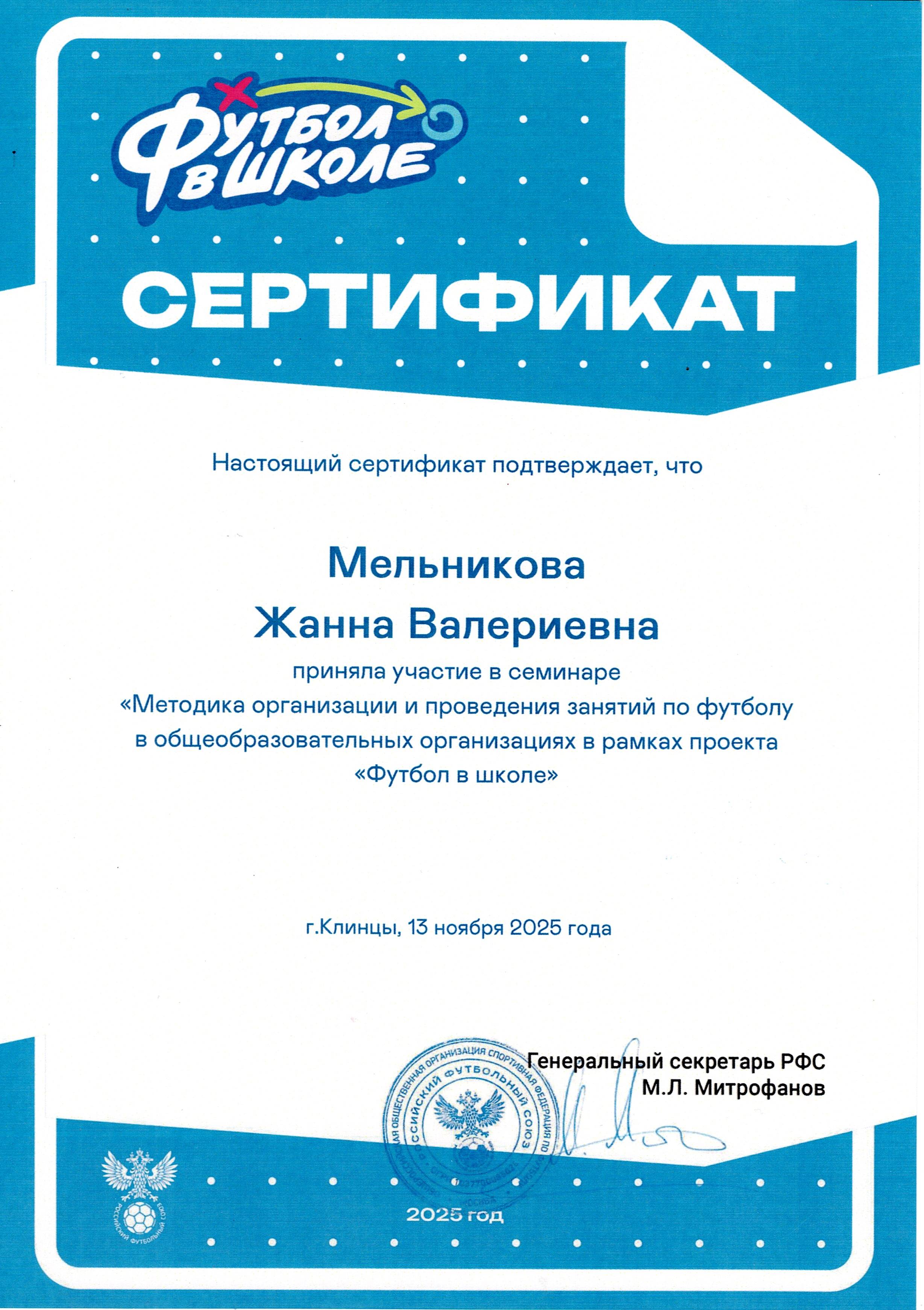 13 ноября 2025 педагог МБДОУ - детский сад присмотра и оздоровления № 32 "Сказка" г.Клинцы Брянской области, Мельникова Жанна Валериевна, приняла участие в МЕТОДИЧЕСКОМ СЕМИНАРЕ для инструкторов по физической культуре и спорту и для воспитателей детских садов г. Клинцы на базе Школы № 9 им. А.Г. Карлова г.Клинцы, при поддержке БРОО «Брянской областной Федерации футбола».