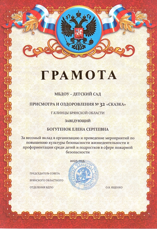 Наша дошкольная организация была награждена грамотой за активное сотрудничество с Брянским областным отделением ВДПО, с движением "Юный пожарный", была отмечена за повышение культуры безопасности среди детей.