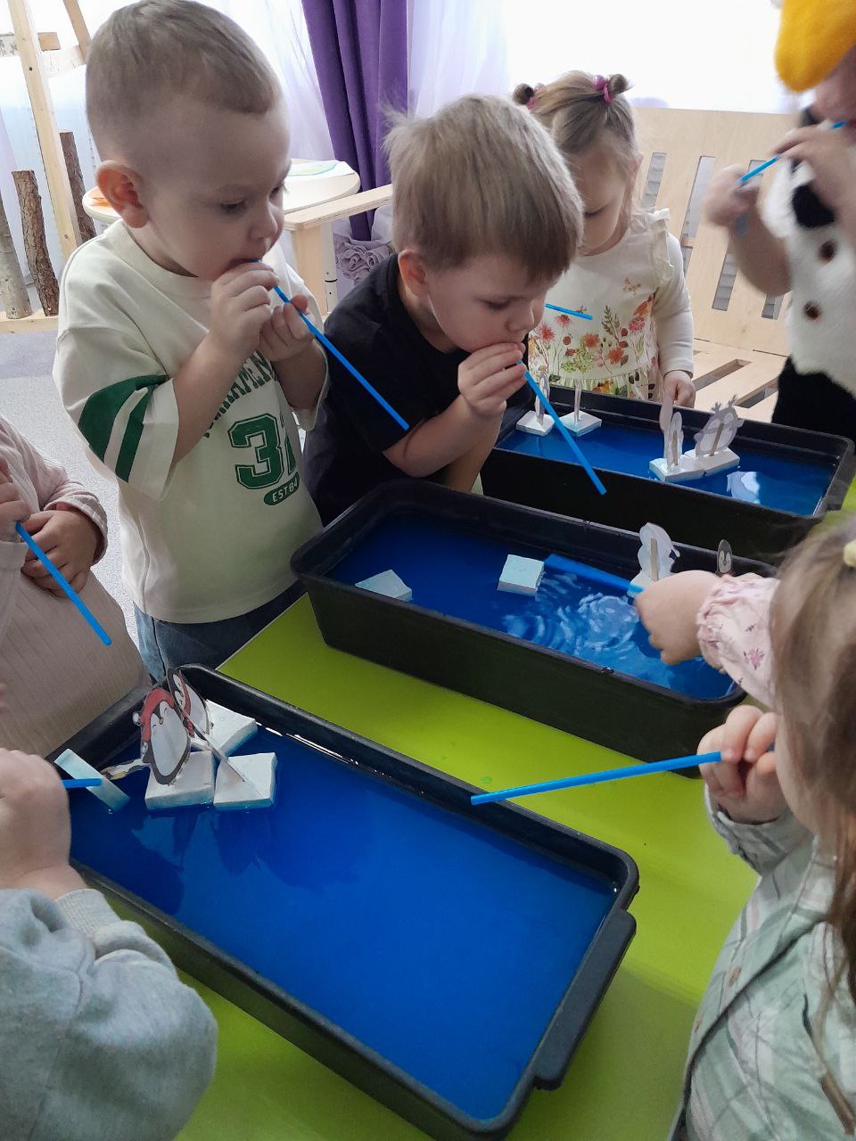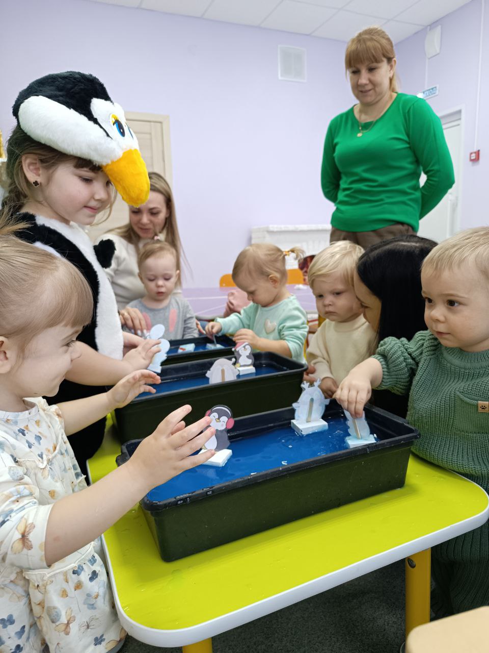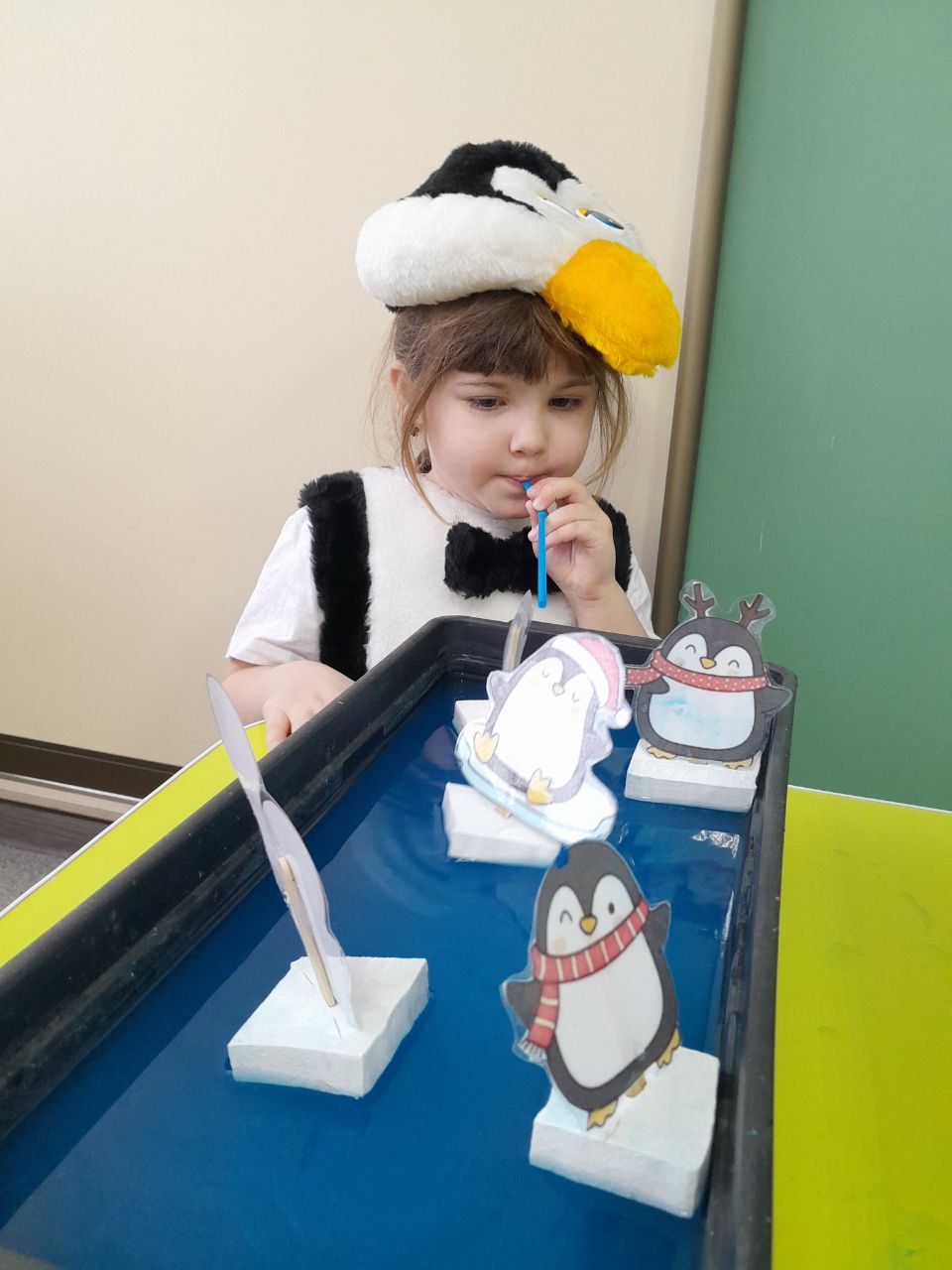 Для ребят открылась творческая мастерская "Весёлый пингвинёнок", где их ждали весёлые игры и интересные задания. В заключении мероприятия ребята нарисовали льдину для пингвина, где средством изображения стал самый настоящий окрашенный лед.