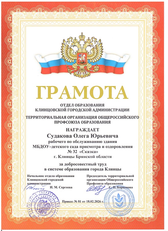 Судаков Олег Юрьевич, рабочий по обслуживанию здания МБДОУ - детский сад присмотра и оздоровления № 32 "Сказка" г.Клинцы Брянской области награжден Грамотой отдела образования Клинцовской городской администрации и городского совета Профессионального Союза за добросовестный труд в системе образования города Клинцы.