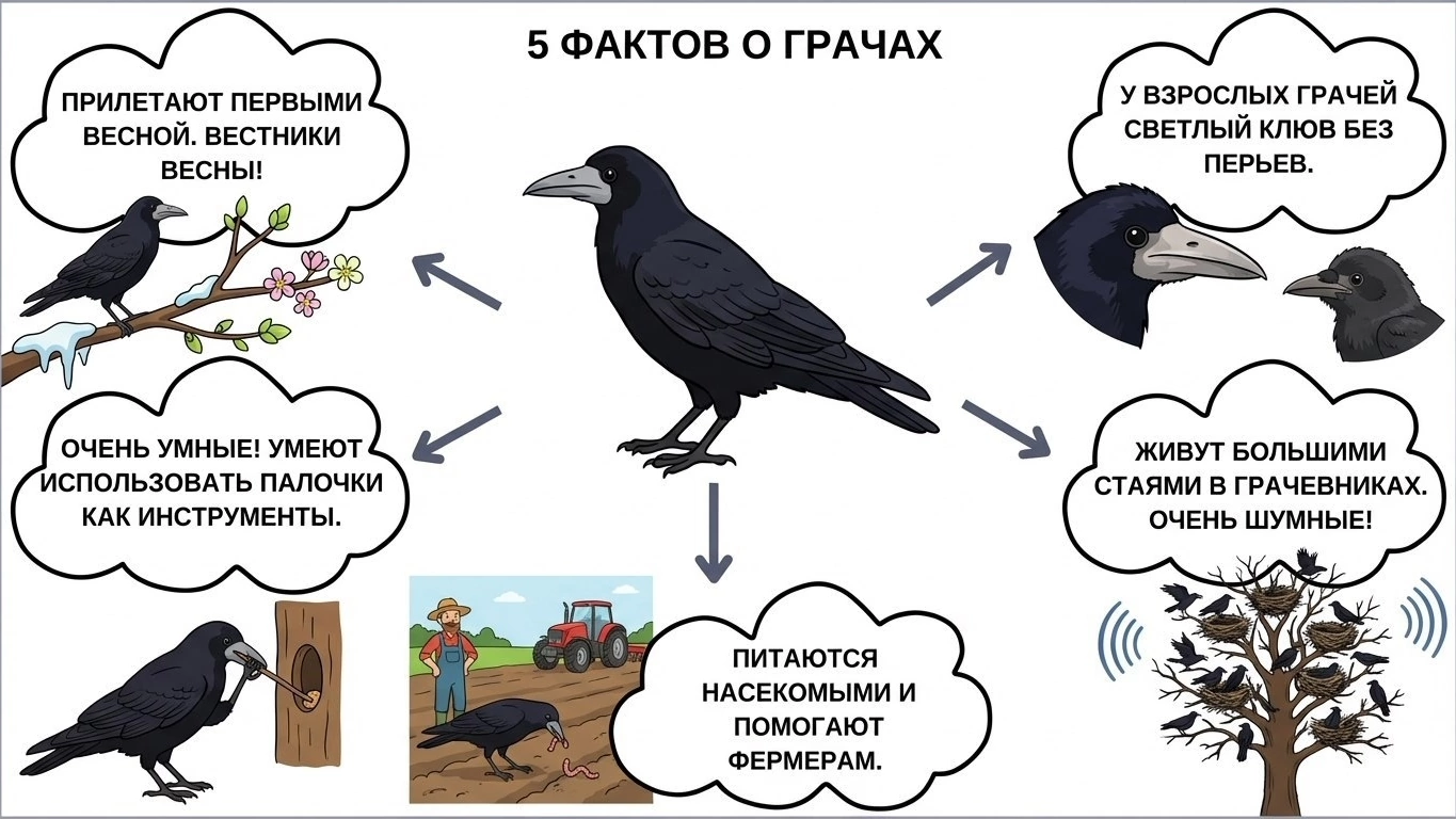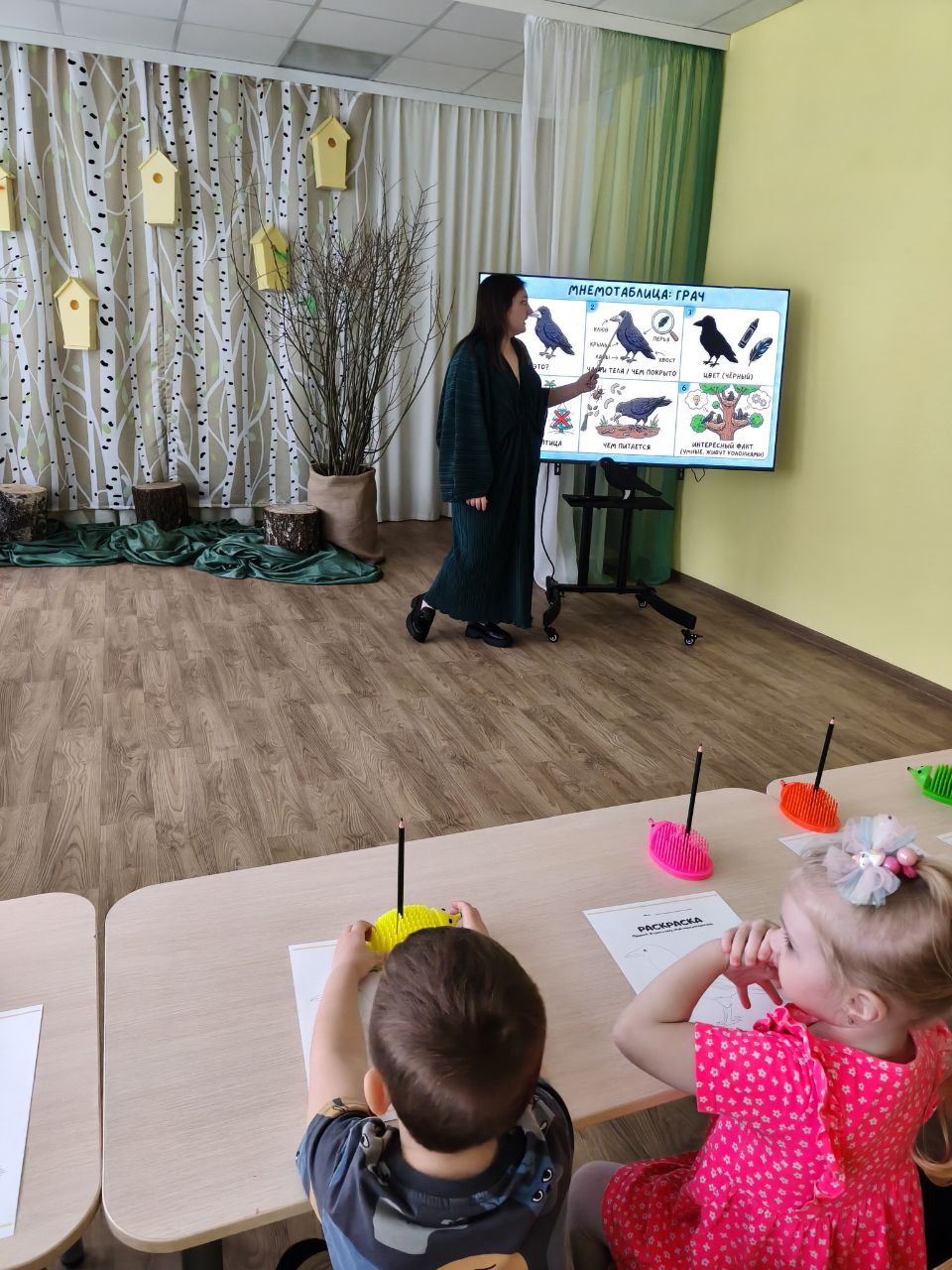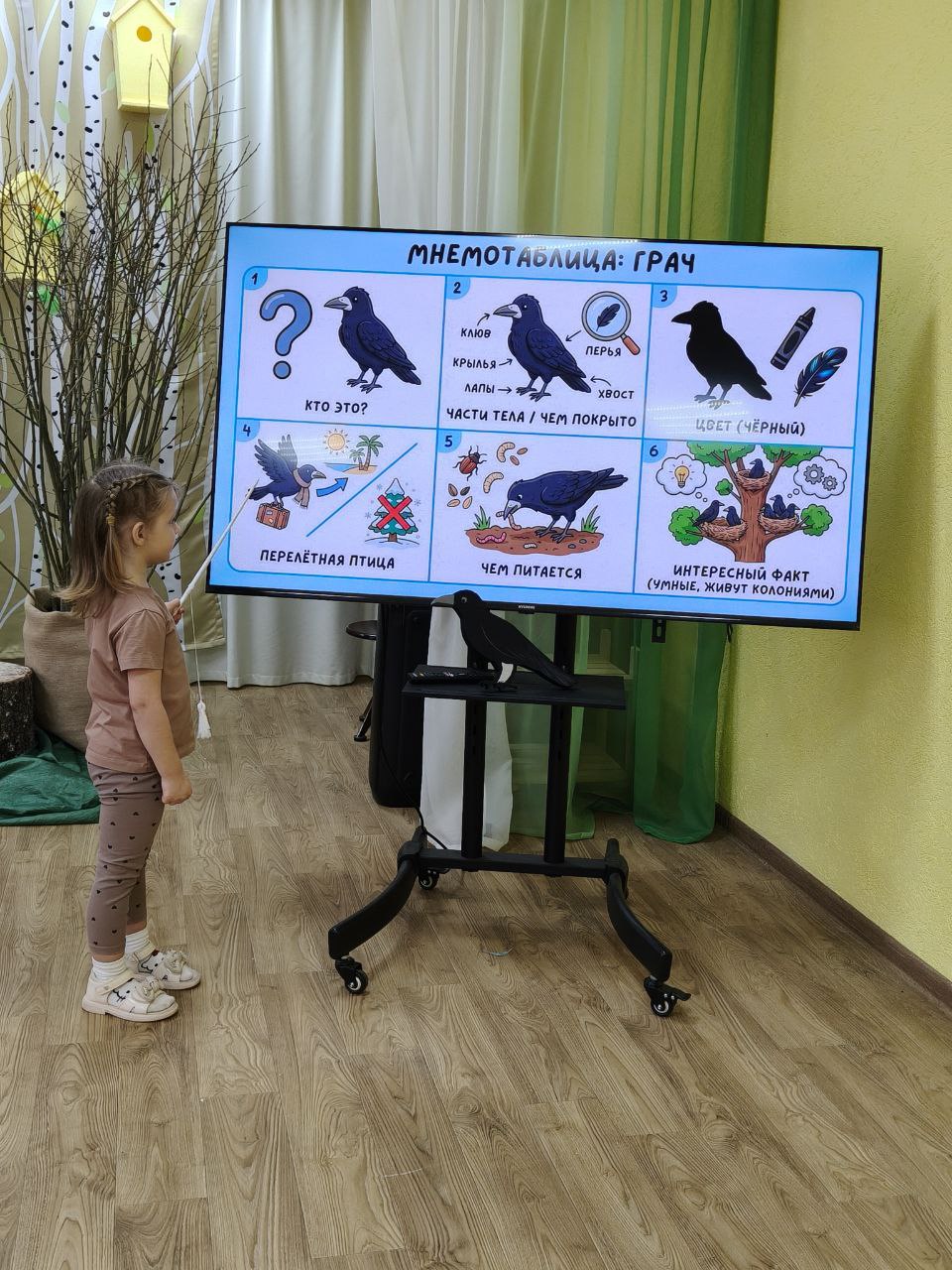 Педагог Поленок Ирина Алексеевна познакомила ребят с интеллект-картой "5 фактов о грачах" и мнемотаблицей. Дошкольники подружились с грачом - ярко, наглядно, легко и с интересом. А мнемотаблица стала основой для составления описательного рассказа.