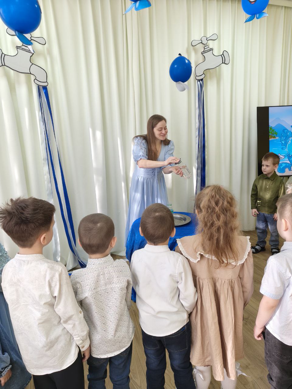 Педагог Меньшикова Анна Алексеевна рассказала ребятам авторскую сказку "Приключения капельки", в ходе беседы дети закрепили свои знания о том, где человек использует воду.